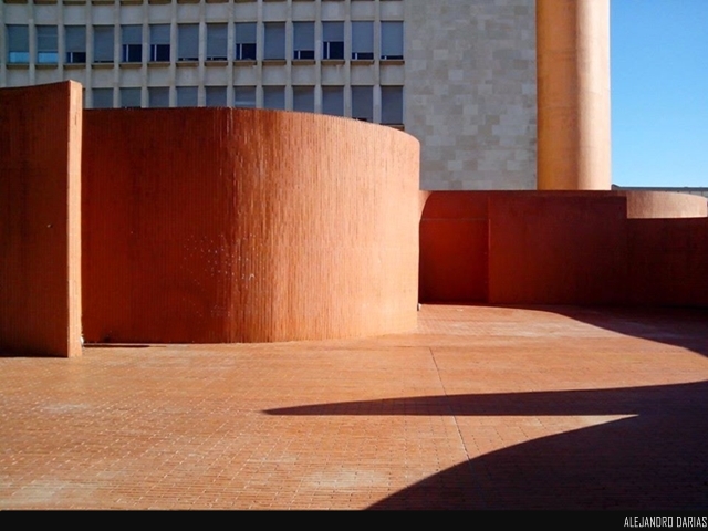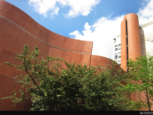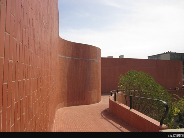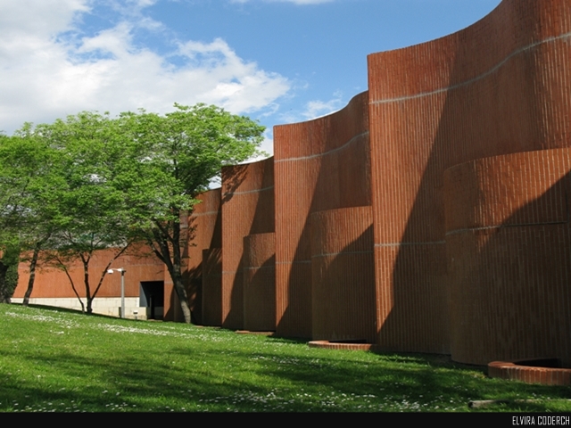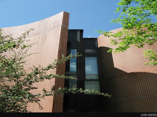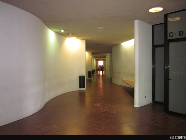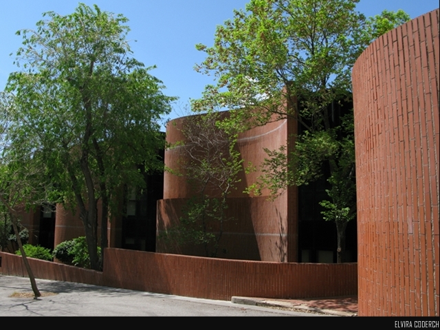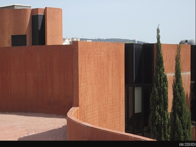 Consideramos que puede ser interesante el recorrido interior que conduce a las aulas, por su mismo trazado y la calidad de la luz tamizada por la pared curva del fondo. Pretendemos que las aulas se organicen de forma que los alumnos queden orientados hacia el jardín, para que puedan mirar al exterior y distraerse en ciertas ocasiones. Pensamos que el tratamiento exterior debe diferenciarse claramente de el del edificio existente. En este sentido se adopta la plaqueta, material tradicional y experimentado, que se adapta perfectamente al proyecto.” J.A. Coderch de Sentmenat