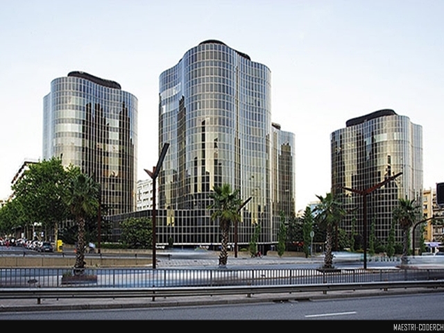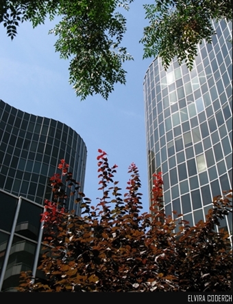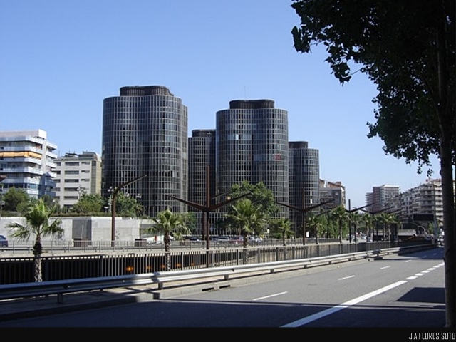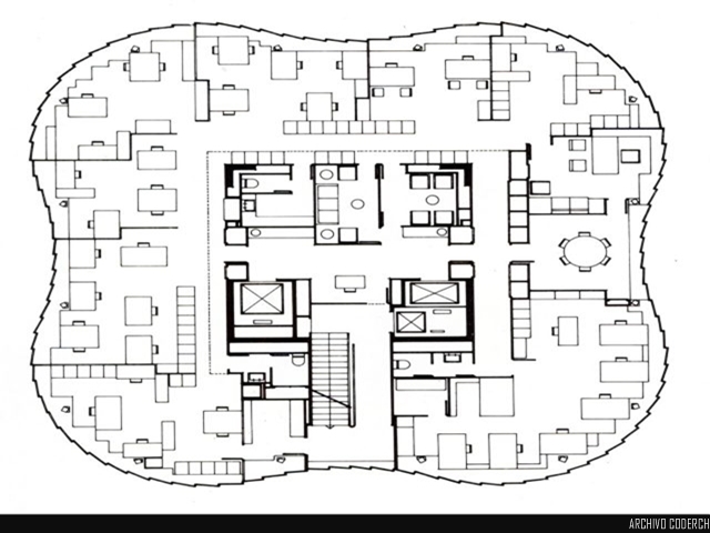 "This is also a case apart, since being the volumetric composition compulsory and only being able to suppress the aggressiveness of the edges by softening the outer space, we adopted a solution based on curves, in which a small sawtooth was set instead of a polygonal line. The shape of the towers' curve tries to correct, as far as possible, the sensation of heaviness that the bound volume had. In the decoration of the common services Mr. Carreras intervened decisively. We designed the decoration of two sample floors of the towers". J.A. Coderch de Sentmenat |